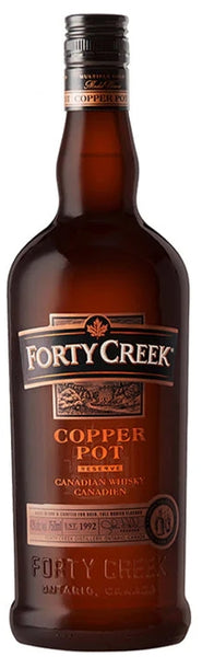 Forty Creek Copper Pot Reserve Canadian Whisky is a rich and complex small-batch expression crafted by individually distilling rye, corn, and barley grains in traditional copper pot stills before aging them separately in oak barrels and carefully blending them for depth and balance. The aroma opens with warm notes of caramel, baked apple, vanilla, and toasted oak layered with gentle hints of spice and dried fruit. On the palate, it delivers a smooth, rounded texture with flavors of toffee, honey, dark fruit, and subtle rye spice that add character without overwhelming the sweetness. The finish is long, mellow, and slightly warm with lingering oak and caramel tones. Refined yet approachable, this whisky offers a polished sipping experience that showcases the craftsmanship behind Canadian whisky blending.